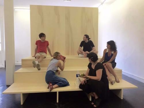 AUTEURS PRÉSUMÉS questionne le statut du commissaire à titre d’auteur. Il s’agit, dans les discussions actuelles autour de son statut législatif, de lui offrir la reconnaissance d’être l’auteur supposé de son exposition en lui attribuant le rôle « d’écrivain » puisque sa pratique relèverait d’une oeuvre de l’esprit. Le projet propose un laboratoire réflexif où artistes et commissaires se rencontrent au coeur d’un espace donné, afin d’établir un dialogue autour de ces enjeux et s’affranchir des codes qui prédéterminent leurs fonctions jusqu’à la perte éventuelle des rôles de chacun. Les collaborateurs prennent part à l’échange durant 2 semaines autour de la pièce Tribune réalisée par Olivier Vadrot (Fr), dont la fonction scénique est de contraindre le corps à la rencontre et à la discussion. » (S.E.C., 2015)
